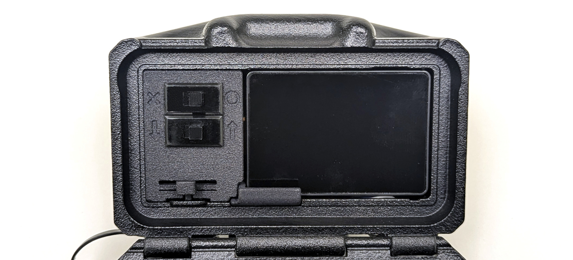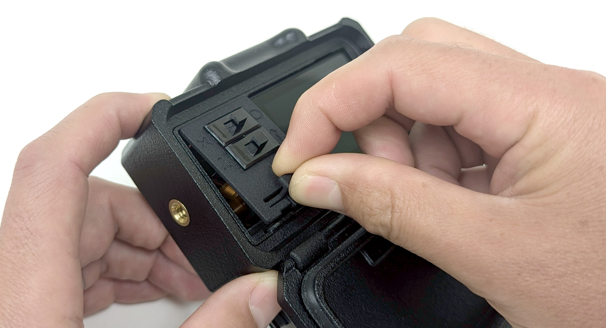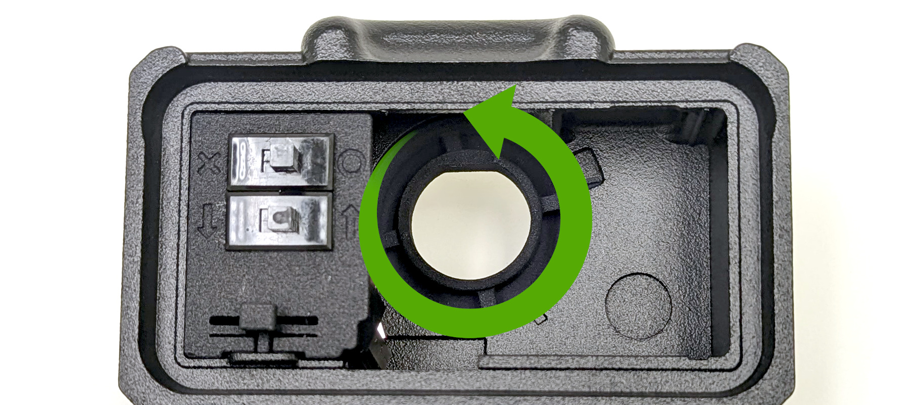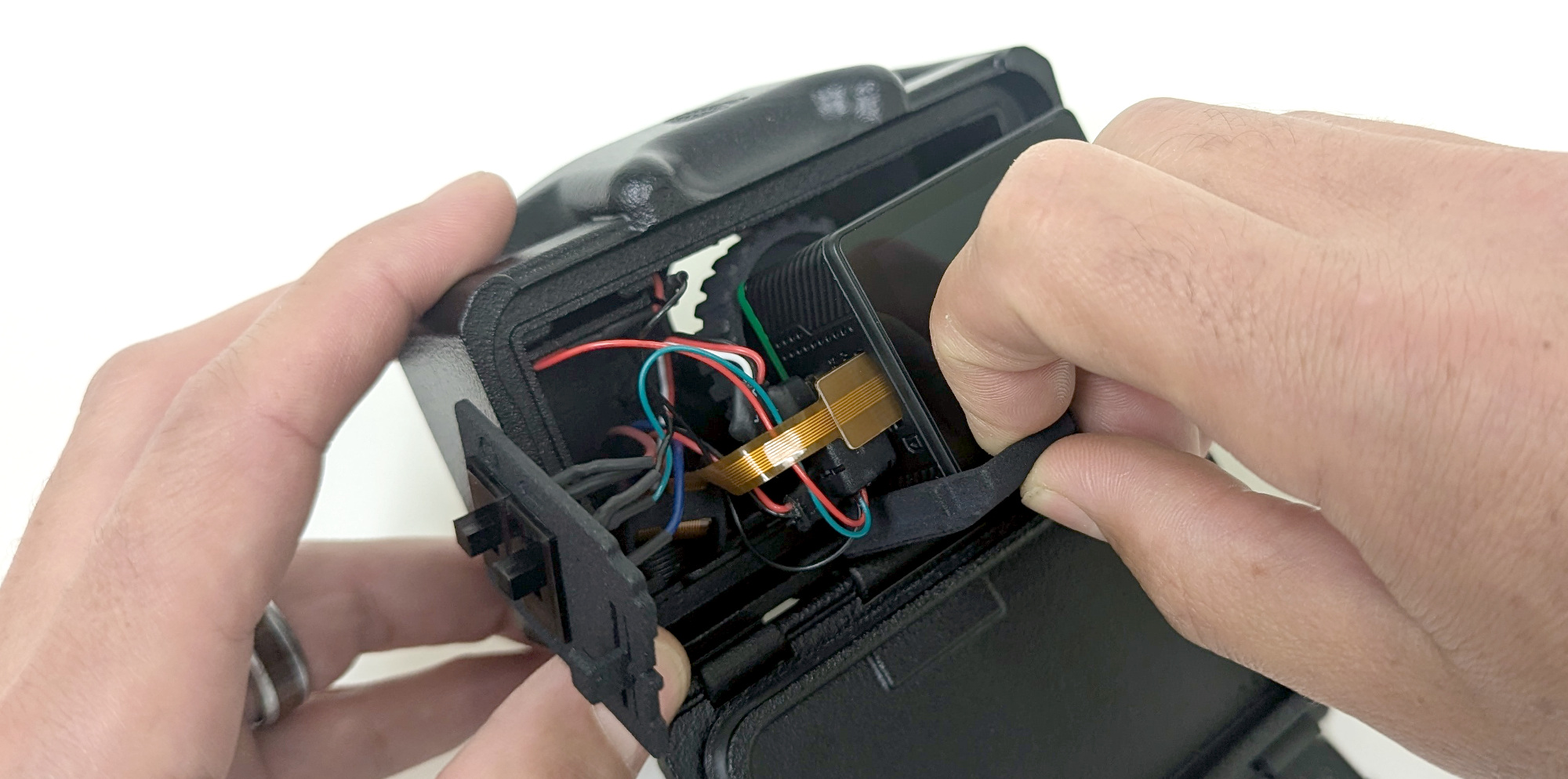 Push the cables inward and away from the camera to make room for the Switch Door. Once the cables are out of the way reinstall the Switch Door by holding the tab until it is seated correctly. You may need to wiggle the tab on the Switch Door until it clicks into place.